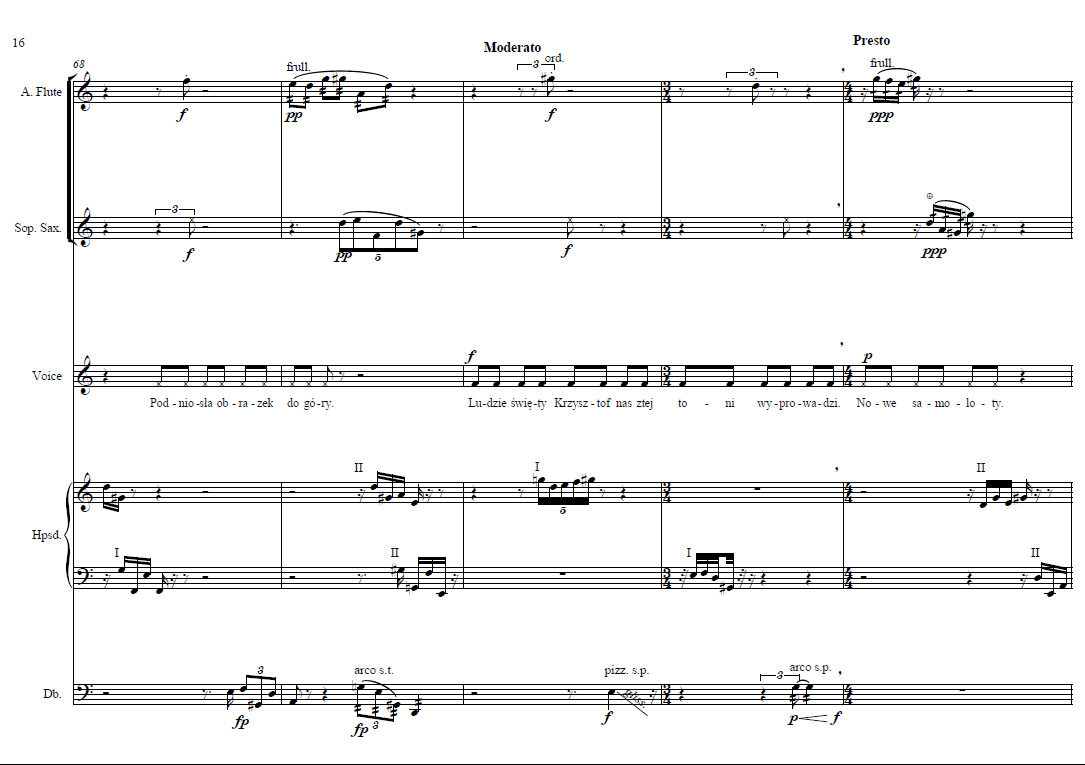 The first stage of my work of course consisted of reading Białoszewski’s work, but in a careful way, already with attention to the text most apt for musical setting. The passages that caught my attention were mainly the most clear, expressive ones, often with onomatopoeic elements