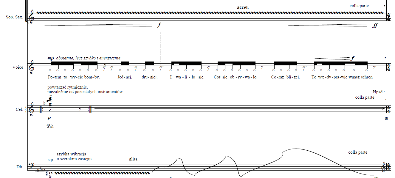 During my composition process I focused on trying to find the best way to underpin the mood of each passage. In the case of the description of falling bombs that meant terror and in the description of the Warsaw Ghetto Uprising it meant grotesqueness. At the same time I was consulting my sketches with many musicians-performers. Furthermore, I was making audio recordings of museums and streets of Warsaw (https://mateuszrettner.com/muzea-i-ulice-warszawy-museums-and-streets-of-warsaw/).